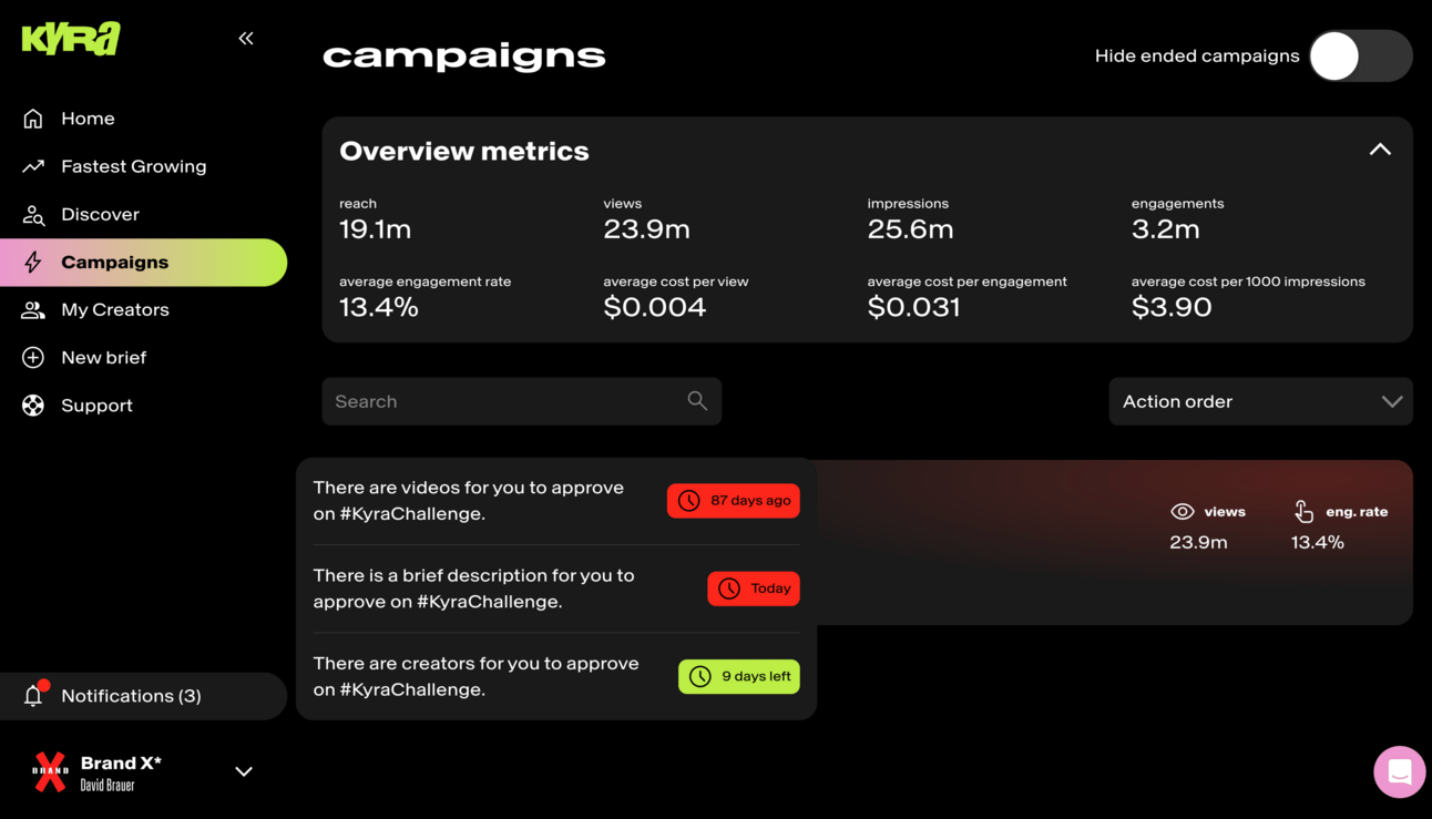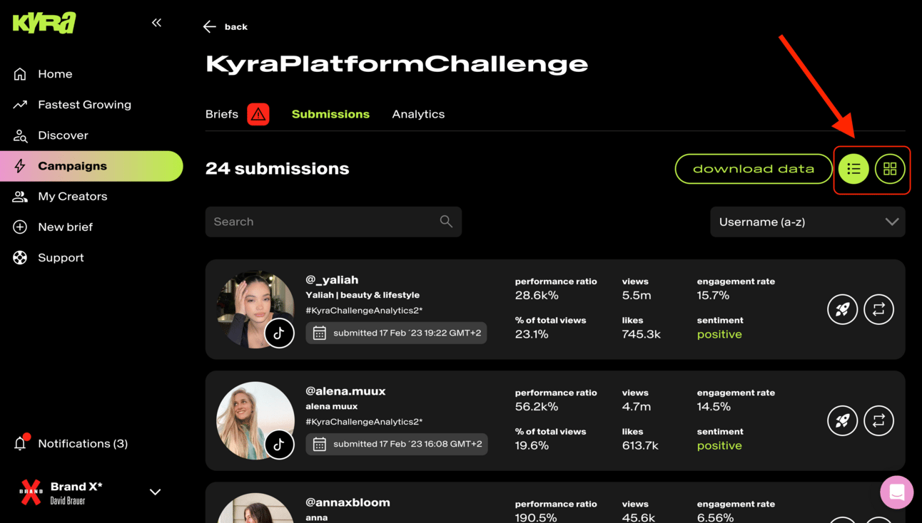 View all the briefs inside a campaign, and aggregated submissions and analytics