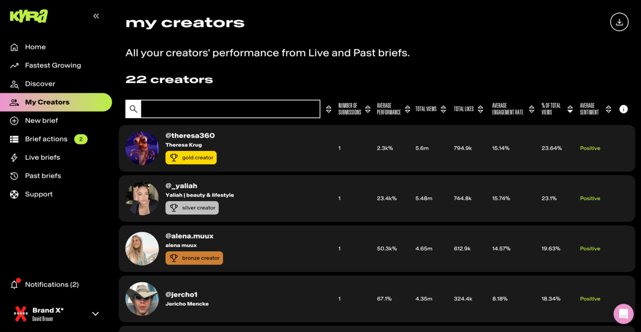 This section shows you a list of all the creators you’ve worked with across all your campaigns (both live and past), and aggregates each creators performance to give you a single snapshot of each creators stats. 📈