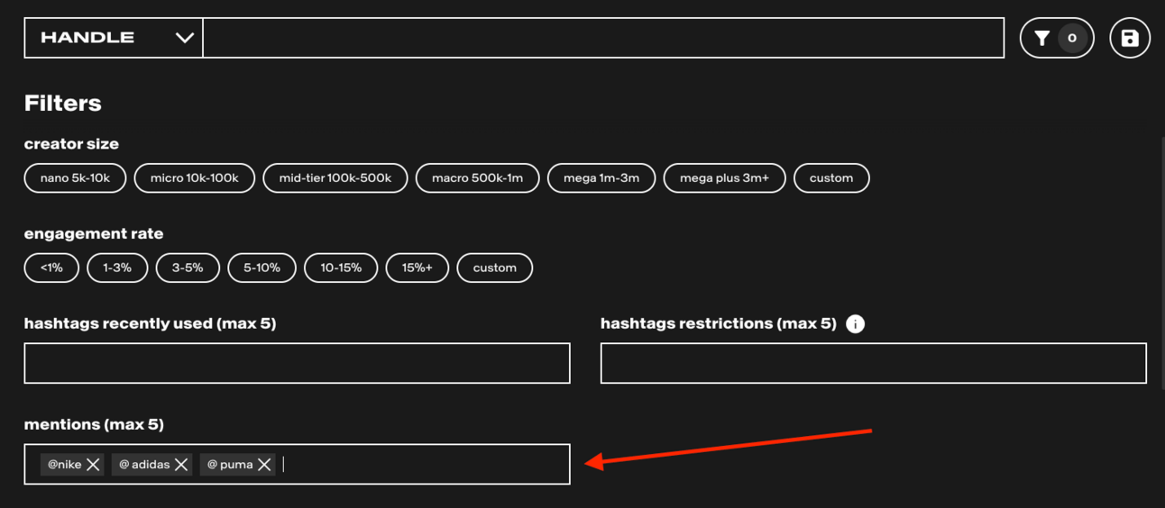 Discover creators by adding up to 5 ‘mentions’ keywords. This filter examines the captions of a creator’s posts and searches for any mentions (@) that matches your keywords. E.g. Input “Nike, Adidas, Puma” to view creators who have been speaking about these brands.
