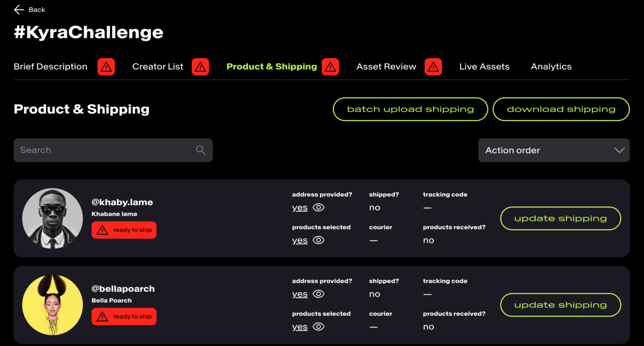 Head to the ‘Product & Shipping’ tab on your brief to see all your creators and their shipping statuses and information. You’ll see:
